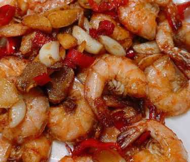 4、做法:将新鲜大虾去壳去肠泥,洗净后用厨房纸巾吸干水分备用。在一个碗中加入淀粉和少许盐,将虾仁放入碗中拌匀,使每个虾仁都裹上淀粉。热锅冷油,将裹好淀粉的虾仁放入锅中煎至两面金黄色即可捞出备用。在另一个锅中倒入少许油,加入葱姜蒜末爆香后加入花椒和黑胡椒粉翻炒均匀。